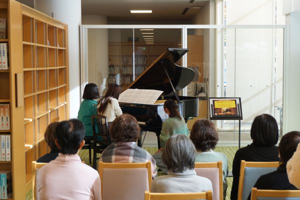 12月10日、子ども学部4年生と味府 美香教授によるピアノの連弾が、2号館ラーニングコモンズにて披露されました。