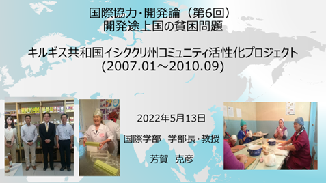 先日の第6回目の授業では、開発途上国の貧困問題の考察を目的として、キルギス共和国で独立行政法人国際協力機構(JICA)が2007年から2010年まで実施した「イシククリ州コミュニティ活性化プロジェクト」を取り上げました。私自身、このプロジェクトに2度訪問した経験があります。