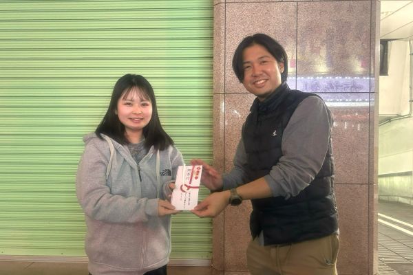 桐友祭終了後、Students of International clubを代表し、子ども学部3年生の松山さんが、KMTカンボジアプロジェクトご担当の高村氏に寄付金をお渡ししました。Students of International clubは、今後も現地の方とオンラインで連携を継続し、花壇プロジェクトに携わっていく予定です。