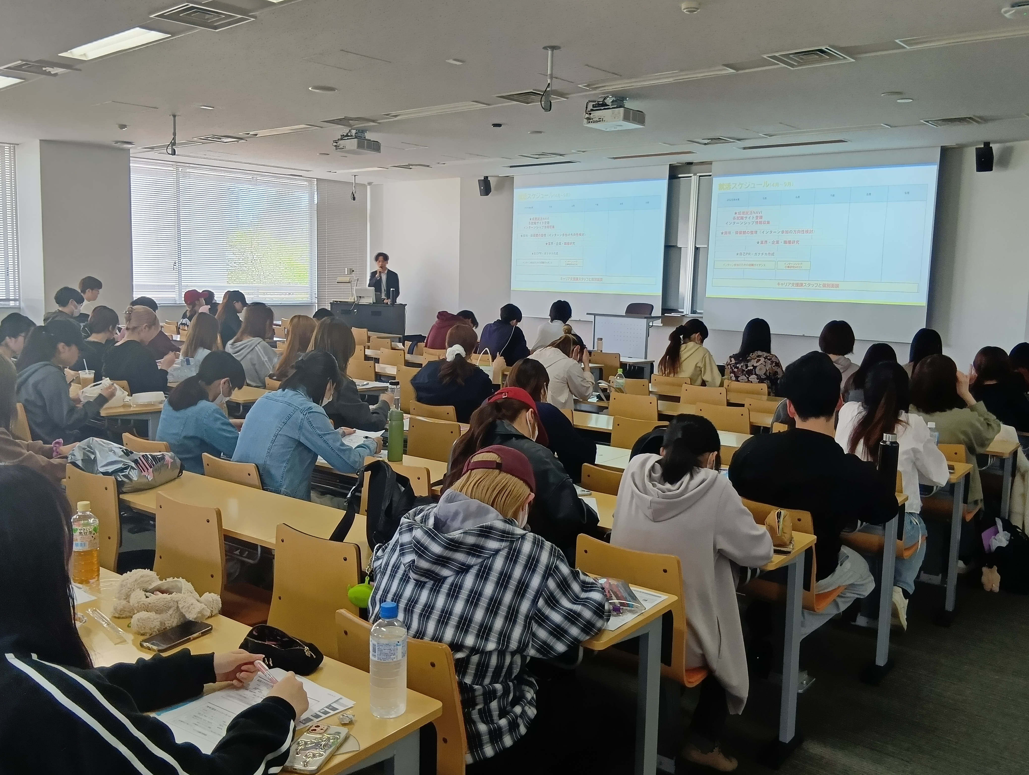 4月14日(火)に「大学2・3年生、短大1年生からの就職活動の流れと夏インターンシップの重要性」ガイダンスを開催しました。参加した学生は、今後の就職活動のスケジュールとインターンシップの参加に向けて行うことを学びました。学生からは、